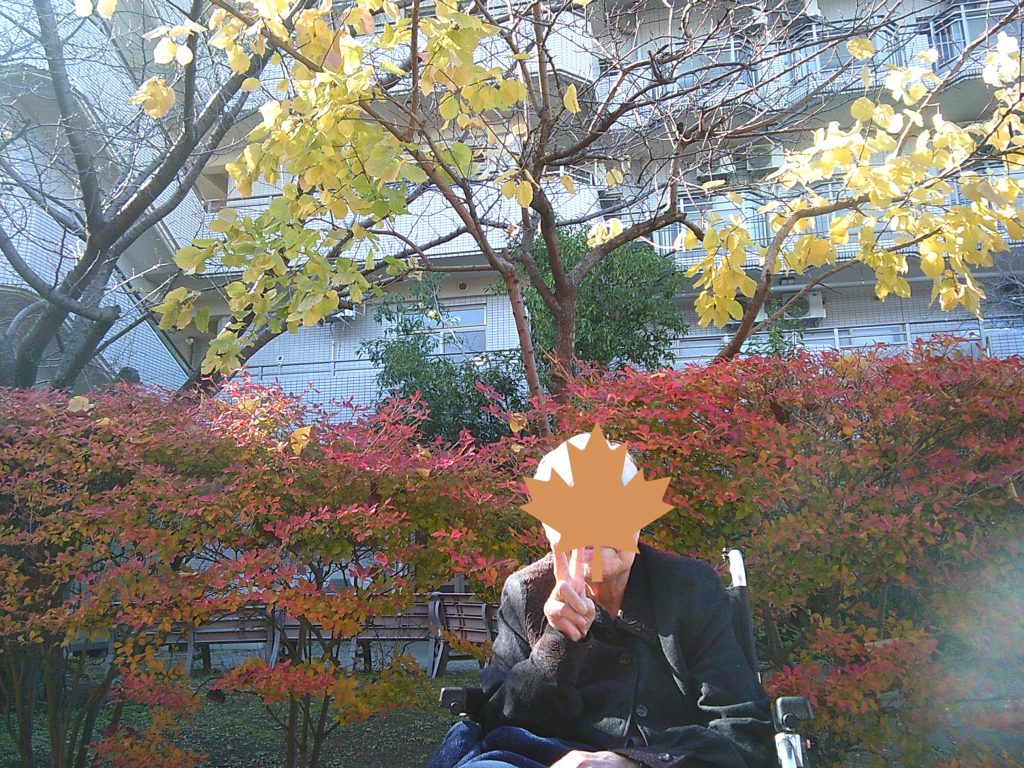 落ち葉をお土産にフロアに戻ると他の利用者様から「綺麗な色だね」「すっかり秋なんだね」とお話され季節感を感じたそうです❗天気のいい日はまた一緒によろしくお願いします😎😎